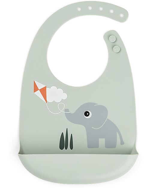 Questo morbido bavaglino in silicone con tasca raccogli briciole è è fatto con il 100% di silicone alimentare.