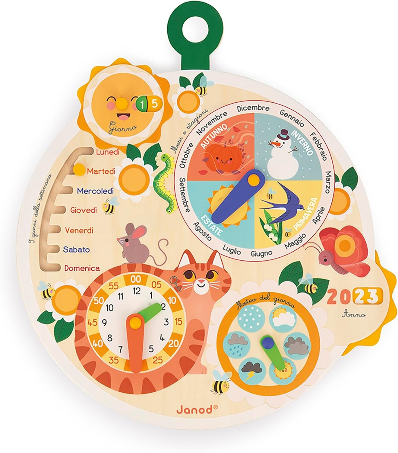 Ruota il sole per selezionare la data, indica i giorni con il cursore, segna l'ora girando le lancette e associa mesi e stagioni.