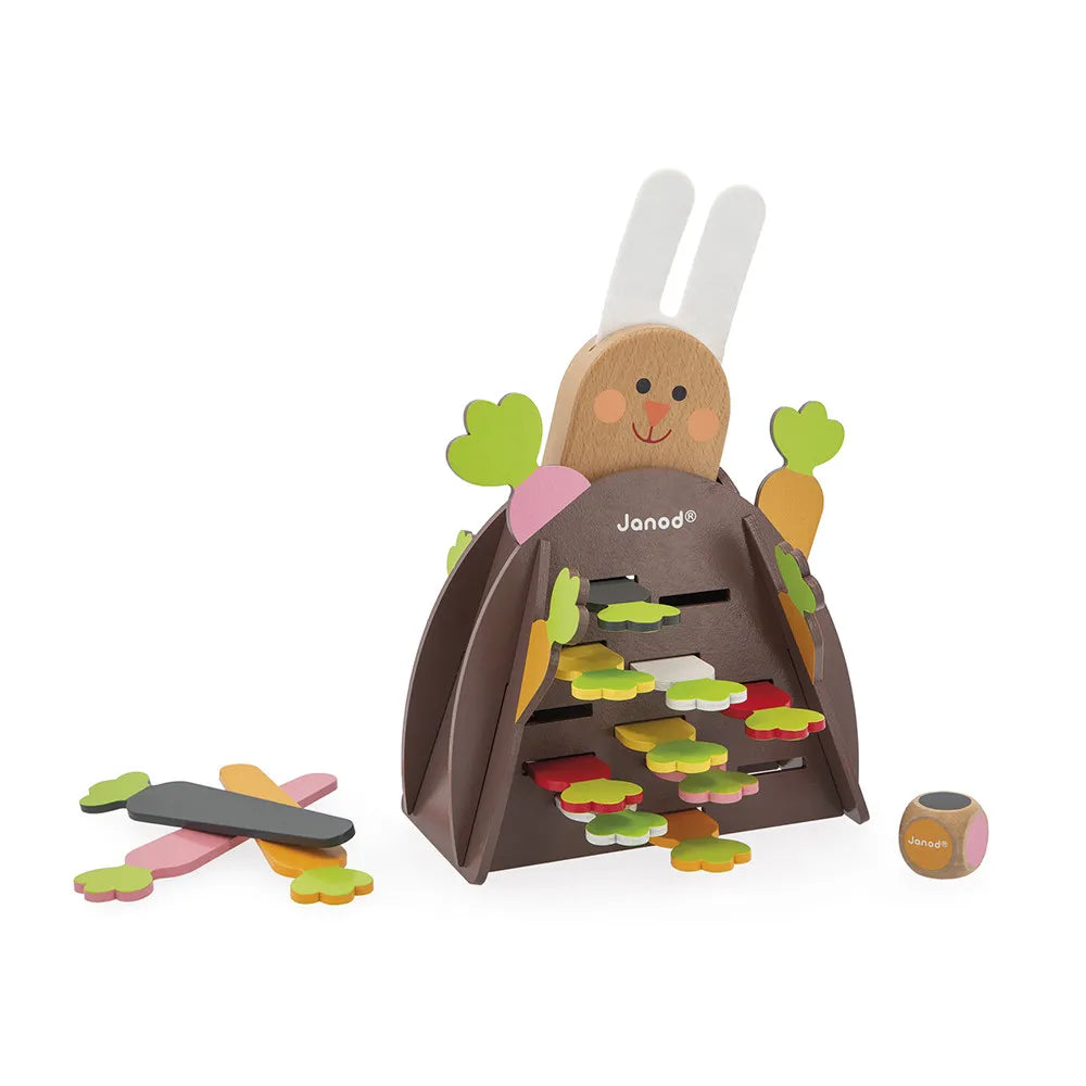 L'orto del coniglio è pieno di carote: aiutalo a metterle in ordine senza farlo cadere sul fondo! Durante questo Gioco da Tavolo in Legno, i bambini dai 3 anni in su dovranno dar prova di concentrazione e strategia.