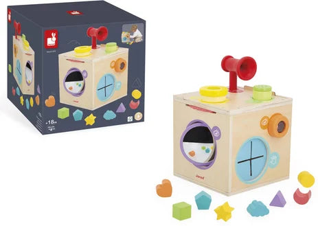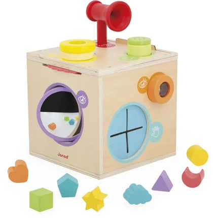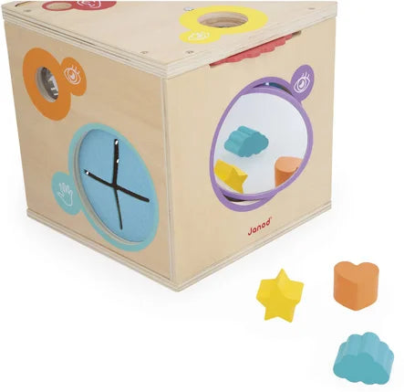 Questo giocattolo di Janod stimola manine e occhi curioso grazie alle sue texture, forme e suoni.