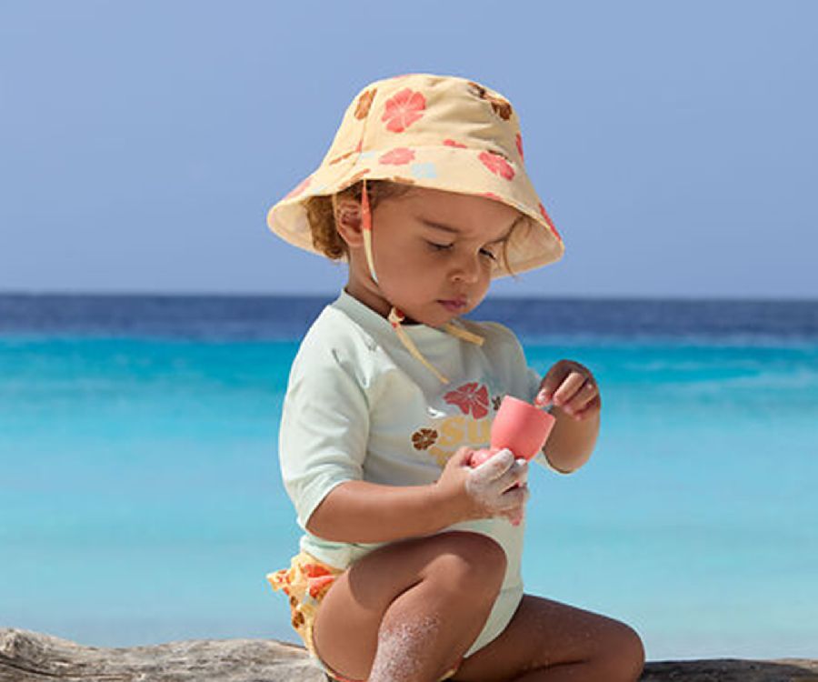 Il cappello di Lässig è reversibile ed con protezione solare +50, da usare anche nell'acqua per proteggere la testa delicata dei bebè.