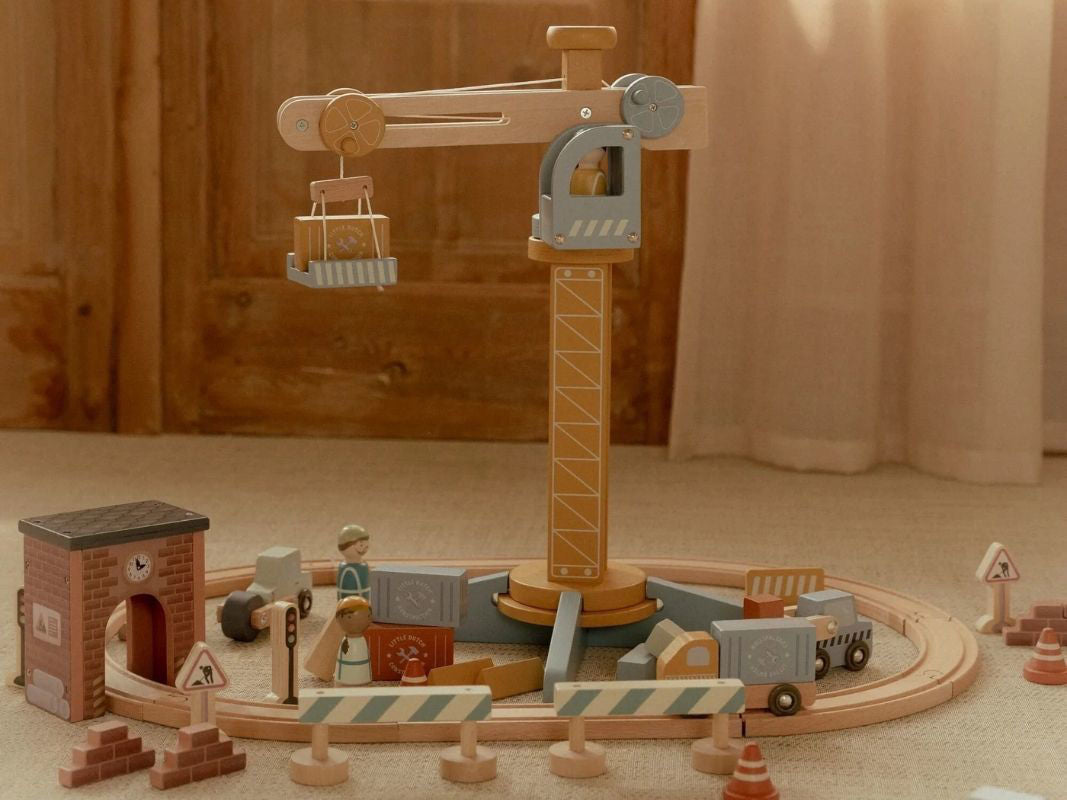 Al lavoro nel cantiere ferroviario! Questo set di Little Dutch trasforma la cameretta in una vera area di costruzione, dove il treno incontra il mondo dell'edilizia. Protagonista indiscussa è la grande gru funzionante, pronta a sollevare e spostare carichi per dare vita a infinite avventure creative.