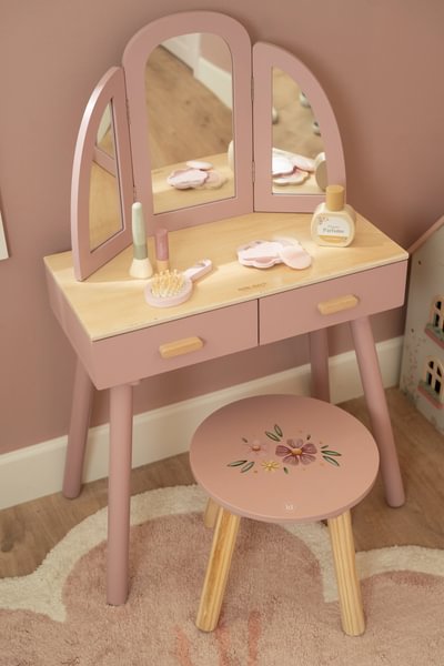 Un angolo magico dove i sogni di ogni principessa diventano realtà! Questa splendida toletta in legno rosa è il posto perfetto per prepararsi per il gran ballo, imitare i grandi e dare sfogo alla fantasia. Con il suo elegante specchio a tre ante e un ricco set di accessori, è pronta a diventare il cuore della cameretta.