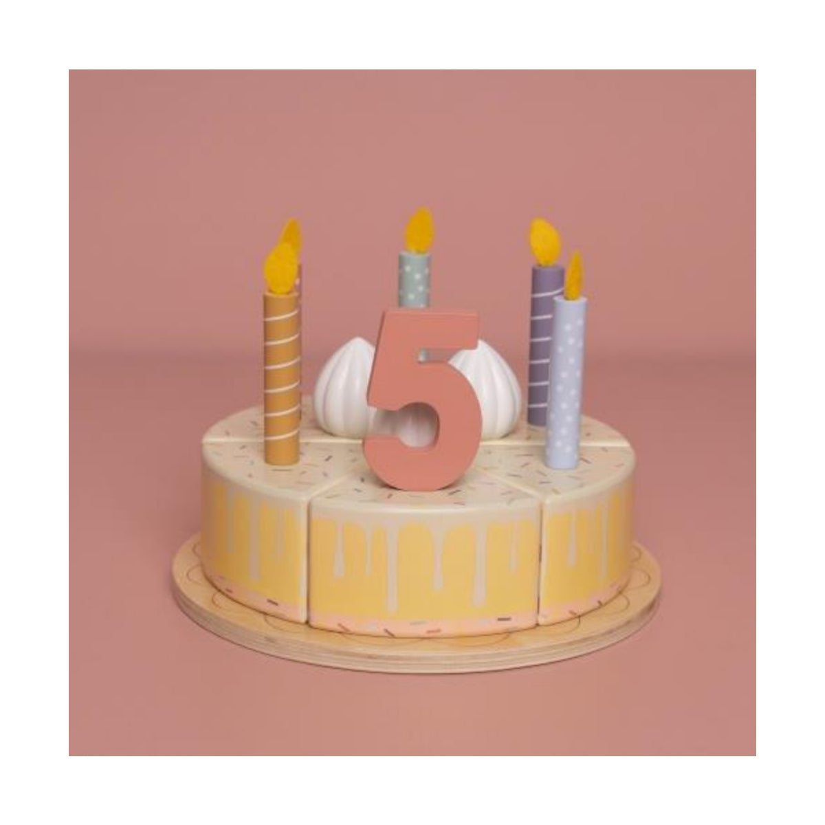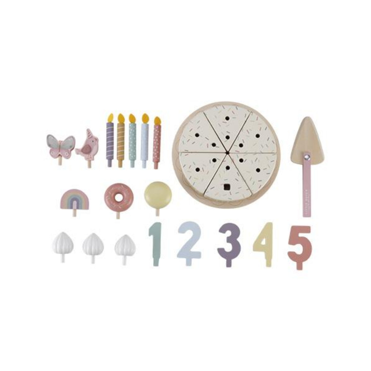 La torta è composta da sei fette su un pratico vassoio, pronte per essere decorate con numerosi accessori inclusi: macaron, ciambella, arcobaleno, simpatici animaletti come la volpe e il leone, panna montata, candeline e i numeri da 1 a 5 per personalizzare ogni festa.