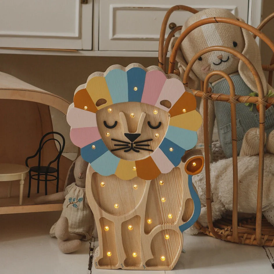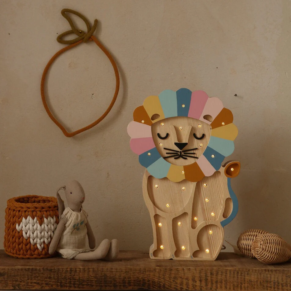 Questa dolce lampada Little Lights a forma di leone color arcobaleno retrò trasformerà la cameretta del tuo bambino in una piccola giungla, creando un atmosfera calda e rassicurante per il riposo.