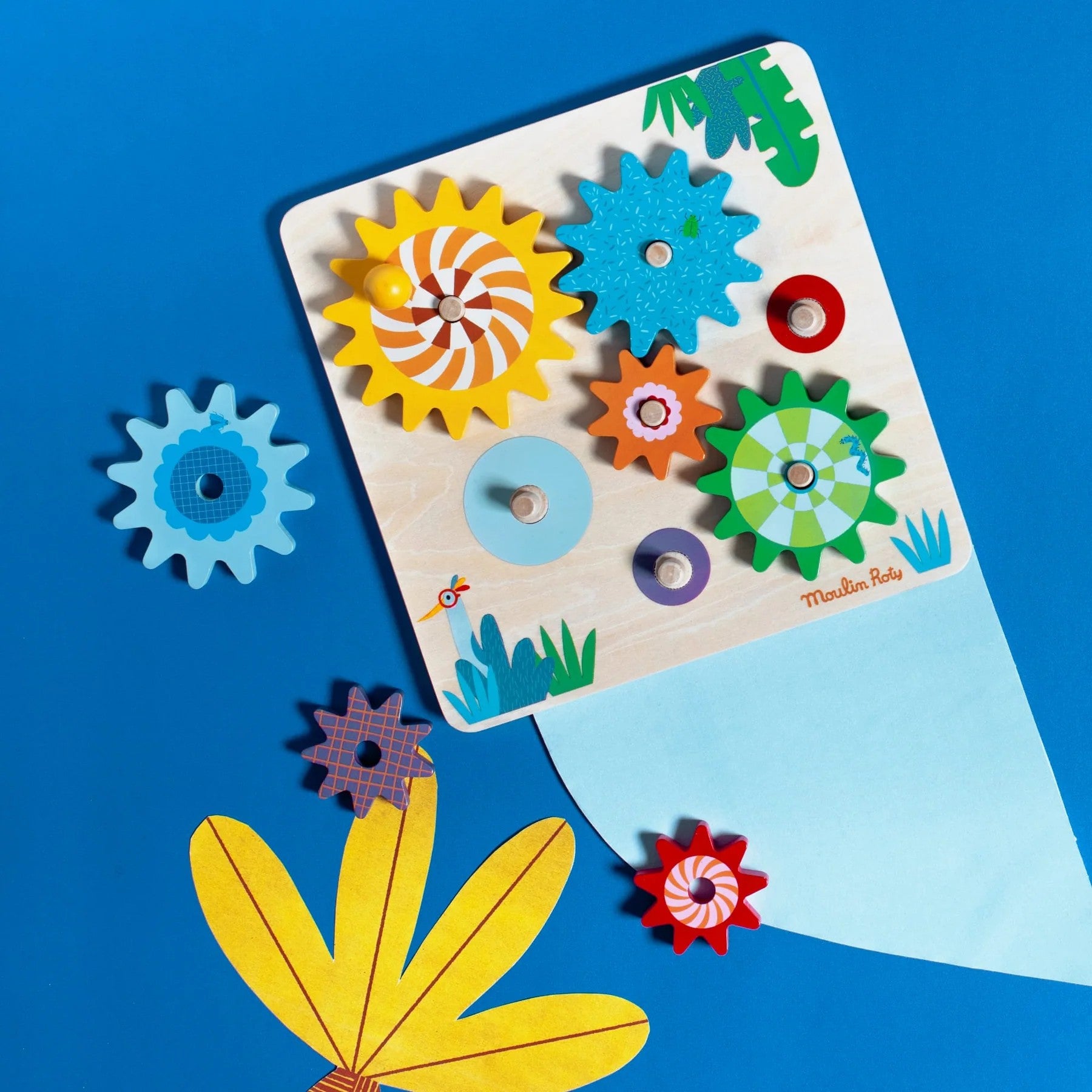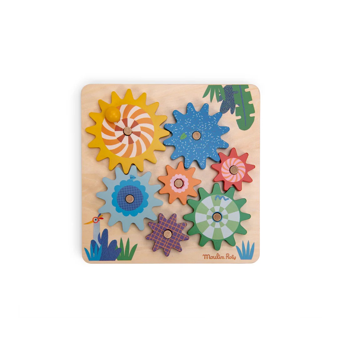 Questo gioco degli ingranaggi è una divertentissima tavola con dei piccoli pioli su cui inserire le varie rotelle.